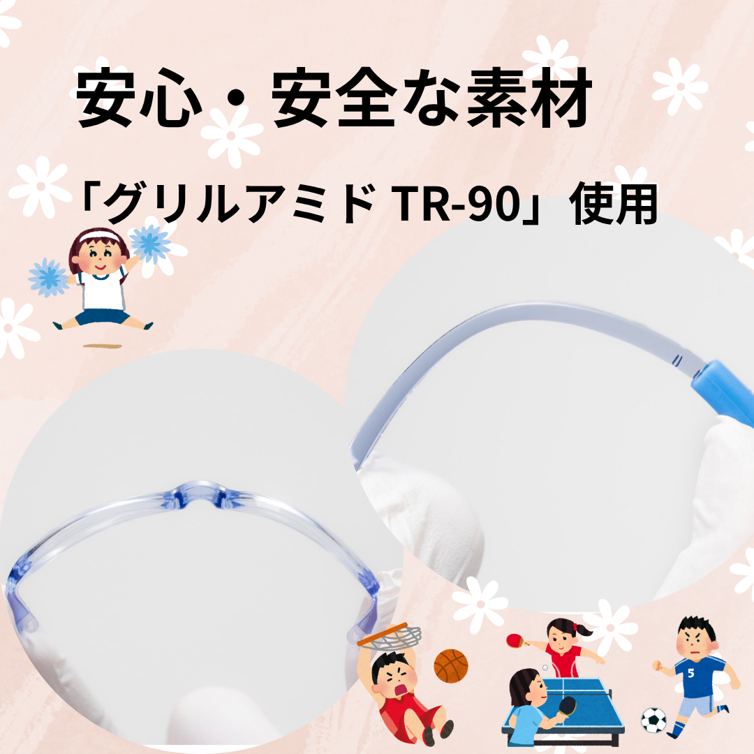 耐衝撃性、弾力性に優れた素材を使用しており 活発なお子さんが顔から転んだ時や 体育の授業の際、お友達とぶつかったなどの アクシデント時も 壊れにくのが特徴です。