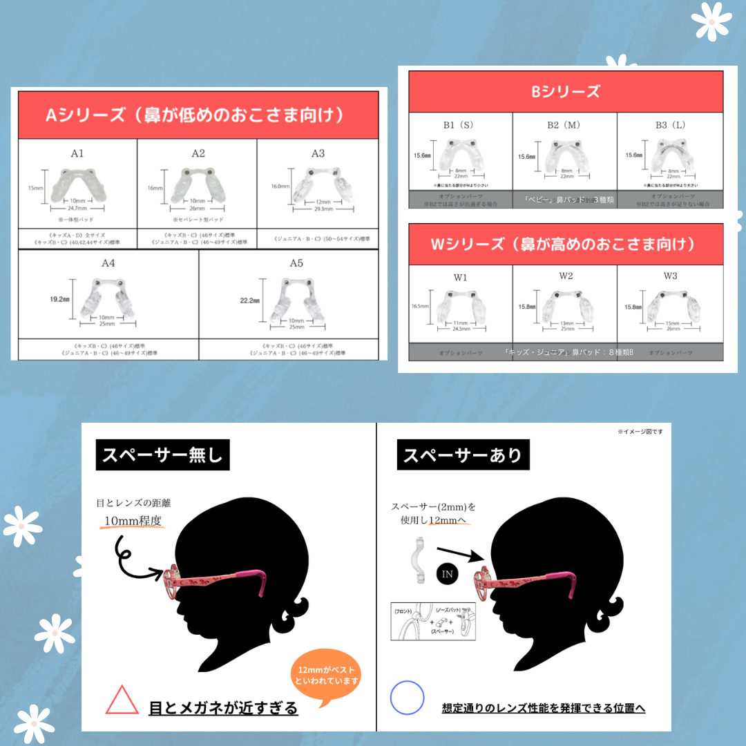 その他「どうしても鼻が低くて、 メガネレンズと眼との距離が近い」や 「まつ毛がメガネレンズに触る」などのお子様には “スペーサー”という部品もございます。