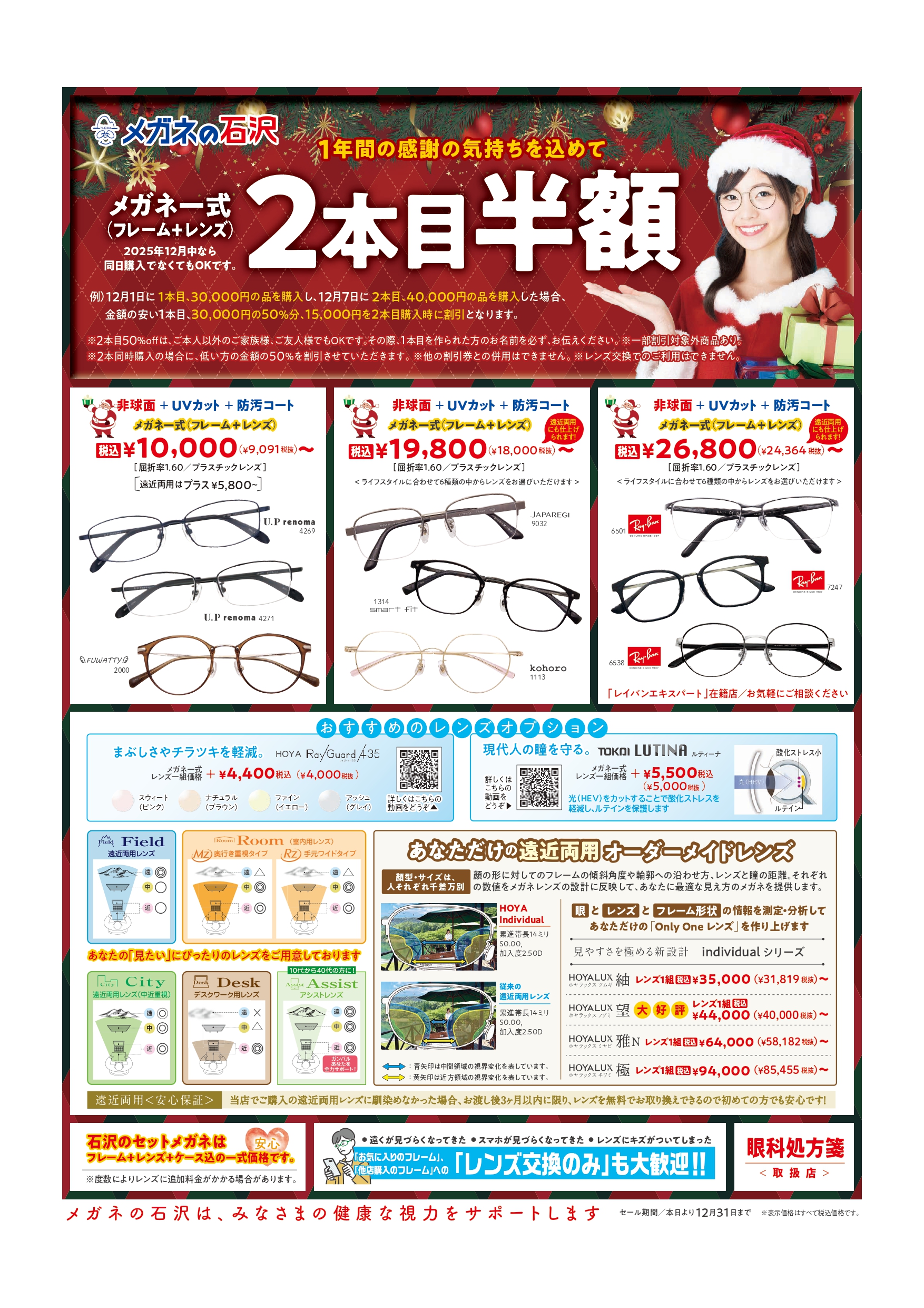 メガネの石沢では、1年間の感謝の気持ちを込めて「メガネ一式 2本目半額セール」を開催いたします。