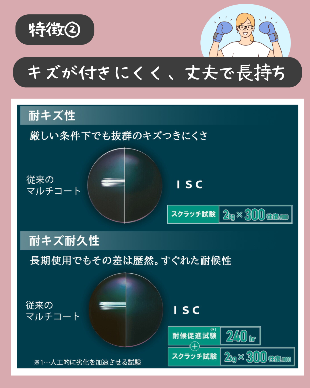 第2の特徴が 耐キズ性が従来のメガネレンズよりも 長く続くんです!