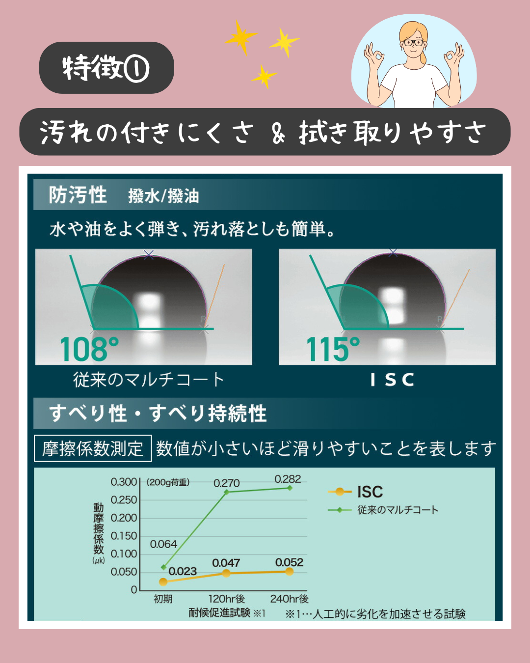 インクレディブルシールドコート(ISC)の 最大の特徴は レンズ帳面のつるつる感です。 従来のメガネレンズコーティングと比較すると 摩擦が少なく、驚くほど滑らかな滑りです。