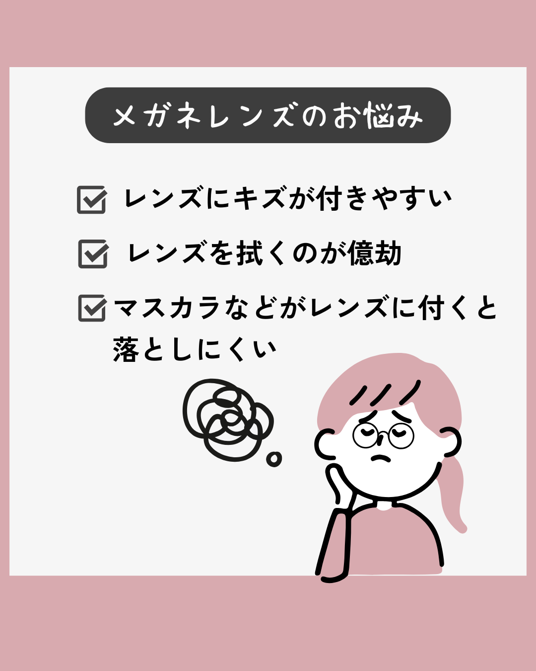 「前髪に付けたヘアオイルや マスカラがメガネレンズに付いちゃった。」 「知らぬ間にレンズがキズだらけになってる。」など 汚れは“付く”ときは一瞬なのに、 “落とす”には手間がかかりますよね。